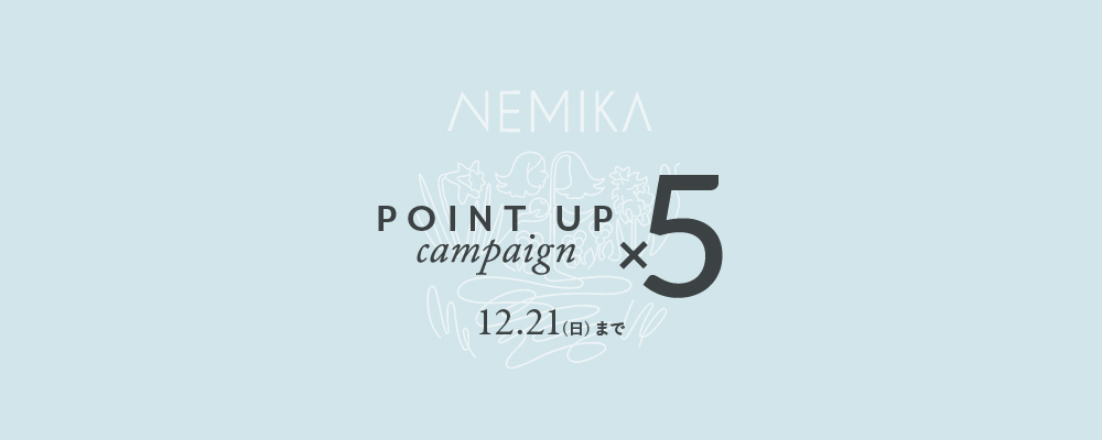 NEMIKA 2025/12/5 12.5 Fri. – 12.21 Sun NEMIKA SHOPでは 12/5(金) ~ 12/21(日)まで ポイント×5倍フェアを開催いたします。 ぜひお近くの店舗までお越しください。 NEMIKA広尾店 MAP> NEMIKA自由が丘店 MAP> NEMIKA神楽坂店 MAP> NEMIKA星が丘店 MAP> NEMIKA神戸阪急店 MAP>